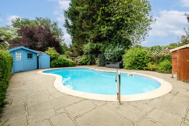 The rear garden features a paved patio, private south-easterly-facing garden with mature trees, a number of well-stocked flower and shrub beds and a swimming pool. At the front there is a double garage with a large driveway that accommodates multiple cars.